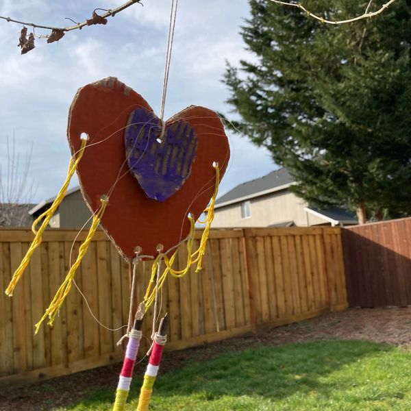 Using corrugated cardboard pieces from a used box can become a powerful example of the cycle of what trees do for us. Where does cardboard come from? Bingo! So, you use natural glue and paints (see below) to create a colorful and fun valentine to hang on a special tree for Valentine's Day!