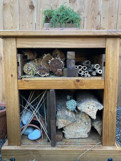 amazing "Bug Hotels" that inspired us to give it a try once we returned home. With dwindling open spaces and wild habitats, even insects need places to thrive. We need our helpful bug friends, such as the Mason bees, ladybugs, snails, caterpillars (hence, butterflies and moths), and spiders so as to keep in check any unwanted non-native critters and to be a part of the life cycle of a healthy ecosystem as food for birds and other animals. Please read my narrative with photos below to learn how you can build your own Bug Hotel! Thanks to WhatsNextForEarth for the Art Call!